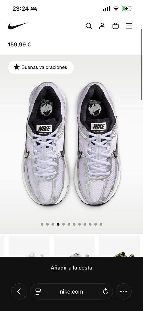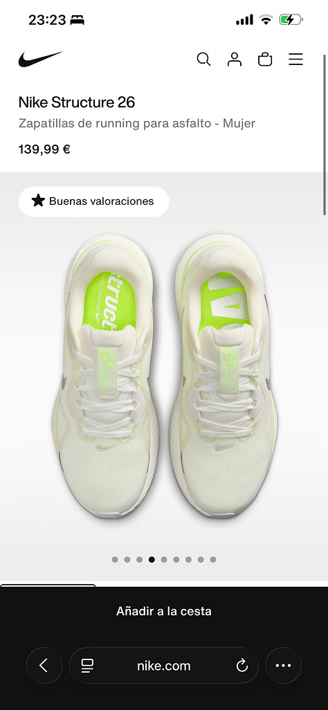 También estoy decidiendo unas nuevas zapatillas para correr, no me gustan las que tengo, serán buenísimas, pero la telilla de encima la odio, sujeta poco el pie y a mi me gusta que sujeten mucho, he visto un par en NIKE muy chulas, quizás es hora de volver a mi primer amor.